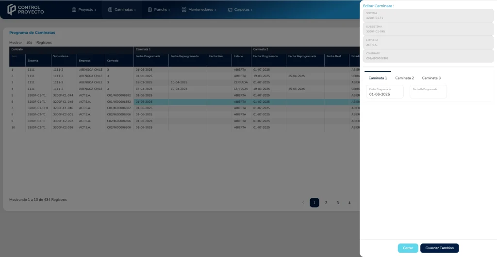 Gestión de Caminatas: Programa Caminatas 1, 2, 3 y Caminatas No Programadas.