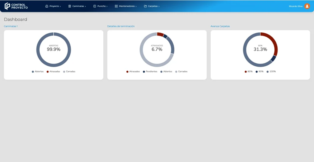 Incluye módulos para gestión WBS, caminatas, punch lists, auditorías, vigilancias, hallazgos, inspecciones, ensayos y paquetes CRP, con notificaciones automáticas y reportes personalizados.