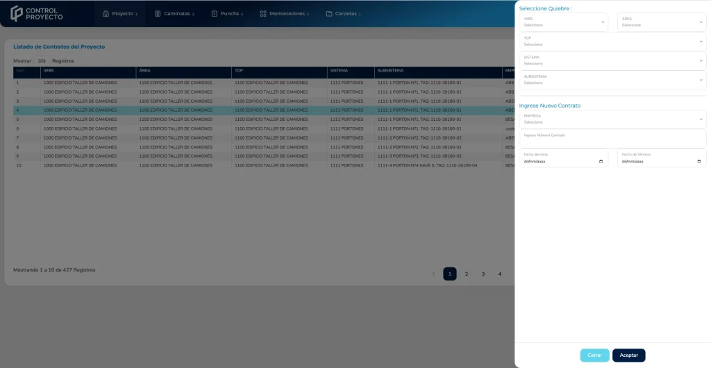 Proceso mediante el cual el equipo de obra, registra el avance en la completitud del paquete de traspaso CRP. Se registra y se almacena historial del porcentaje de avance, dejando observaciones que deberían solucionar los contratistas.